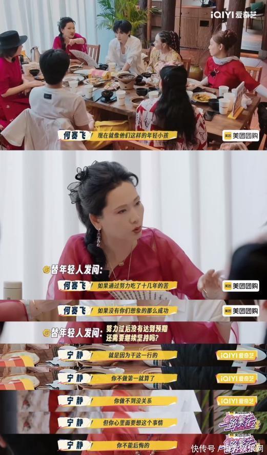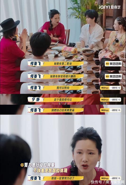 作为一夜爆红的代表,张柏芝和宁静虽然坦诚一夜爆红“蛮爽的”,但对于“努力过后没有达到预期还需要坚持吗”这个更现实的问题,她们也给现在的年轻人十分真诚的回答。宁静认为“在娱乐圈要有争第一的野心,不能后悔,往前冲别东张西望。”而何赛飞则展现了另一种智慧:“如果不适合,付出了很多也达不到,如果有第二职业可以转向,别把自己往绝路里逼。” 在姐姐们看来,努力是行动的根基,而不执着,则是人生的智慧。