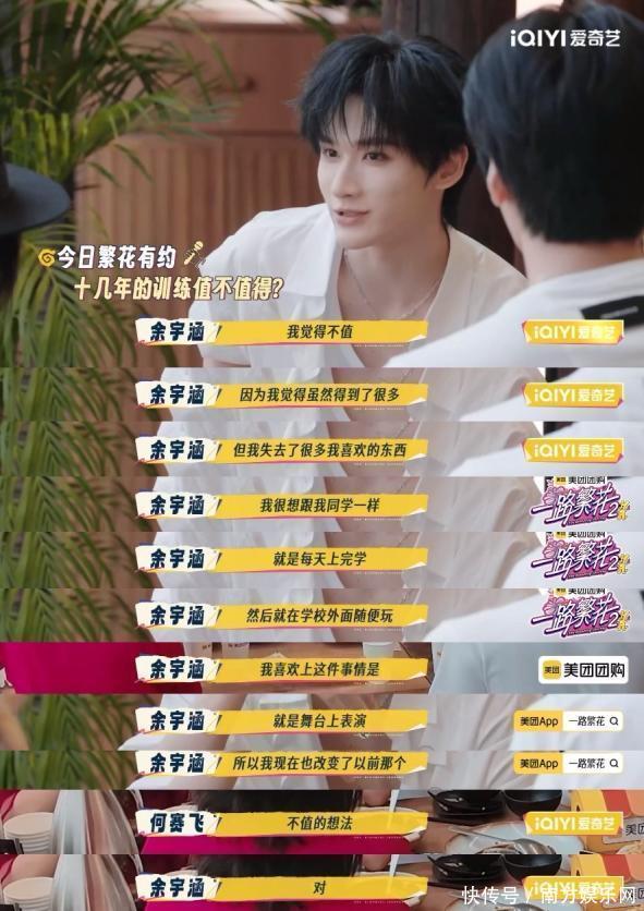 抵达泉州,饭桌上的“今日繁花有约”话题继续。面对影后们关于“十年训练是否值得?”的提问,邵子恒毫不犹豫地回答“值得”,因为他从未给自己留过退路。而余宇涵的回答则更为复杂和真实:“有过不值得的念头。虽然得到了很多,但也失去了像普通同学一样放学后在外面玩耍的自由。” 但话锋一转,他补充道:“当登上舞台的那一刻,又会觉得,一切都是值得的。”这番坦诚的回答,引发了无数网友的共鸣。